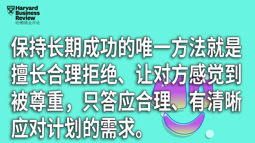 大部分人都有太多要做的事情,却没有足够时间。答应老板、团队成员和其他人的需求可以让你找到存在感,但也会让你感到疲倦。保持长期成功的唯一方法就是擅长合理拒绝、让对方感觉到被尊重,只答应合理、有清晰应对计划的需求。