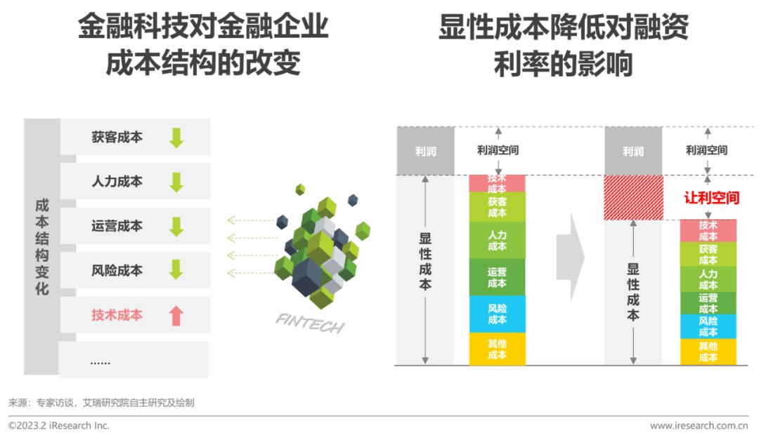 大数据、人工智能等技术手段及科技平台在小微融资领域的广泛应用,帮助融资服务提供方更精准高效的获客、运营及风控,极大的解放了人力需求,促使其成本结构发生变化,获客、人力、运营等显性成本的费用降低。虽然新技术的引入在短时间内会拉高技术支出,但随着收益期的延长,在技术方面的资本投入将逐渐摊平,长期看对显性成本整体的影响较小。在利率市场化、净息差变低等大环境下,融资服务提供方的显性成本降低为小微企业融资创造了更多的让利空间,进而将科技赋能的优势传递到小微群体,在降低金融机构显性成本的同时也降低了小微企业的融资成本。