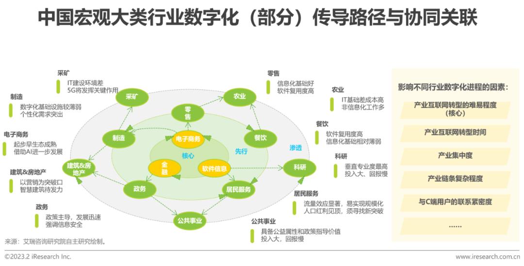 在宏观行业层面上,目前我国各行业的数字化发展阶段具有相当差异。按照国家统计局对我国宏观大类行业的分类,我们认为,金融、电子商务、软件信息三类行业在数字经济生态中位居核心地位,为其他行业进行数字化改造提供支撑,同时,它们也是数字化程度最高的三类行业。从行业内生角度来看,这三类行业的数字化通过业务协同和示范作用向周边行业传导,催生“先行”行业和“渗透”行业逐步进行数字化改造。