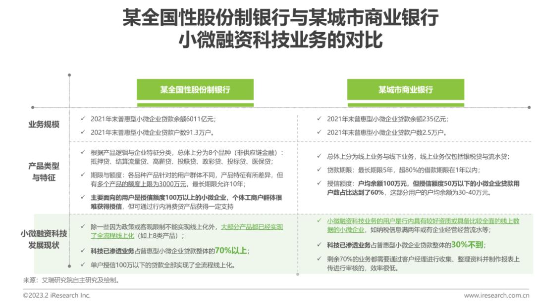 如下展示了某全国性股份制银行与某城市商业银行在小微融资科技业务方面的发展现状对比,可以发现:银行作为小微融资服务的主力,目前正处于较大数字化需求下,也已经在做很大的科技投入,一些具备较强科技能力的全国性银行在小微融资科技业务上已经取得了不菲的成绩,但重点服务“小店”群体的上千家区域性银行在科技能力上还面临着诸多不足,开展小微融资业务效率低下,对“小店”群体的覆盖度还不足。