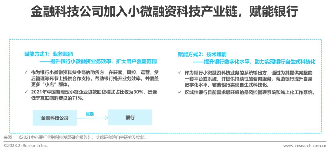 金融科技公司加入小微融资科技产业链条赋能银行主要有业务赋能与技术赋能两种方式: