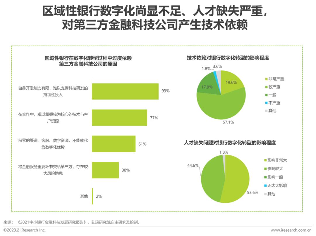 随着金融科技应用深度和广度的进一步推进,区域性银行在运用金融科技推进数字化转型方面均取得了显著的成绩,但与很多全国性银行相比还有较大差距,在战略定位、组织架构、技术水平、科技应用、数据治理、生态运营等各方面面临问题,另一方面,相比具有大量网点的全国性银行,区域性银行在客源上并没有明显优势,技术和禀赋上的劣势以及严重的人才缺失问题多因素影响下,区域性银行对金融科技外部合作具有强烈的需求,并产生了技术依赖。