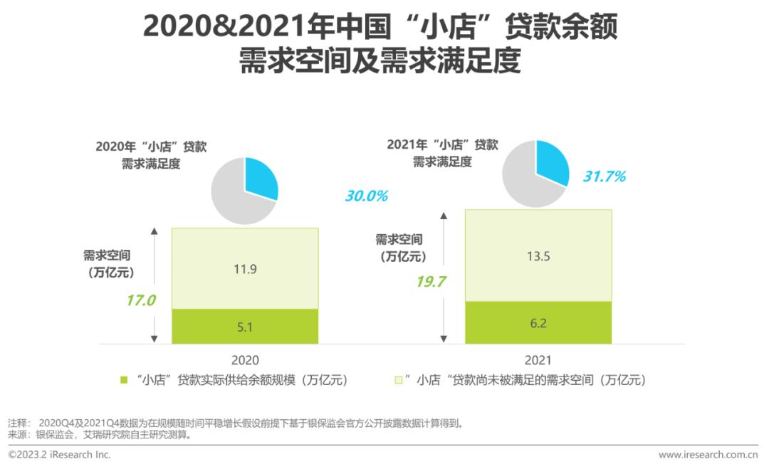 2021年末“小店”贷款需求空间约20万亿,实际供给规模为6.2万亿,贷款需求满足度31.7%,低于小微企业整体水平