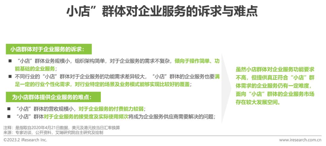 某个产业的企业数字化服务覆盖程度主要取决于某一产业的互联网转型时间以及转型的难易程度,所处产业互联网转型时间、产业集中度、产业链条复杂程度等也是重要影响因素。“小店”作为中国市场的“毛细血管”和“神经末梢”,主要集中在零售、餐饮、服务业等专业技术门槛相对较低的行业,很多“小店”具备着非常具体也非常简单的数字化工具需求,但也正是因为数字化需求比较简化和“小店”们并不具备较强的企业服务付款能力,他们“微末”的需求较少的被满足。