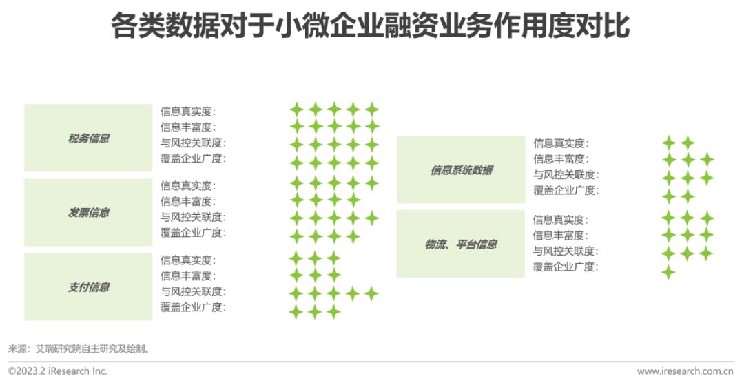 前文已经提到,在从事小微企业融资业务所需要的获客、风控、运营等能力要求中,风控是当下制约业务发展的主要难点。解决风控难点的核心问题是可以找到有效衡量小微企业还款能力与风险系数的数据。目前市场上可用于小微企业风控的线上信息主要包括供应链信息、税务信息、发票信息、支付信息、用电信息、信息系统数据等,各类数据对于小微企业融资业务的作用度在信息真实度、信息丰富度、与风控关联度、覆盖企业广度等方面存在差异。