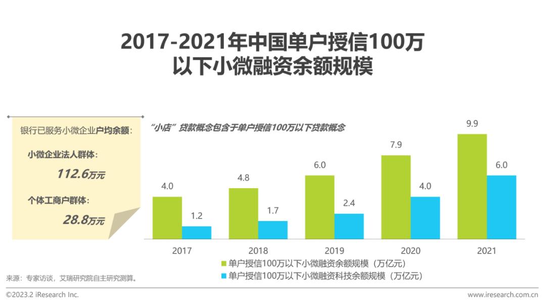根据艾瑞测算,目前银行小微企业融资服务已经覆盖到的群体中,企业法人群体的户均在贷余额为112.6万元,个体工商户群体的户均在贷余额为28.8万元,可以说,“小店”(个体工商户群体)贷款概念是包含在单户授信100万以下贷款概念中的。2021年,中国单户授信100万以下小微企业贷款余额为9.9万亿元,科技化规模为6万亿。