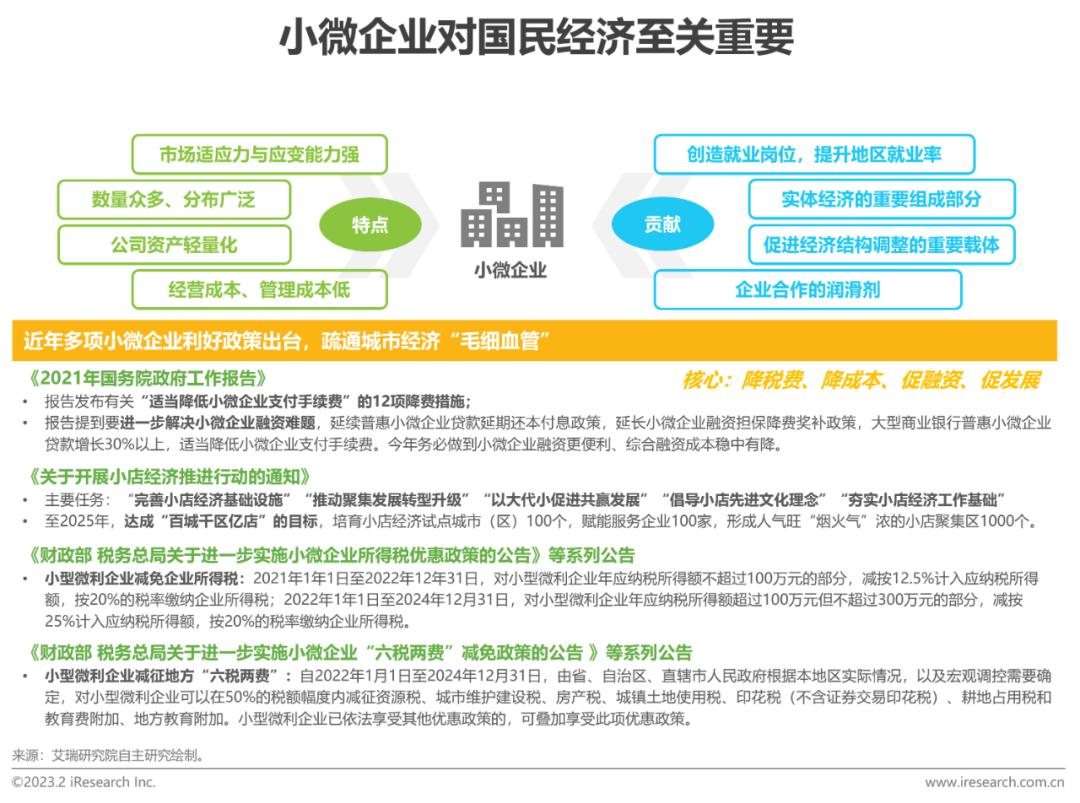 在此背景下,2023年2月,艾瑞咨询联合信也科技、中国中小企业协会、人民日报数字传播共同发布《乘风破浪:科技筑梦小店未来——2022年小微融资发展与展望研究报告》,报告意在关注小微企业融资的基础上,重点 聚焦“小店”群体,通过对小微融资及小微企业数字化服务行业发展的剖析,展现科技对小微企业及小微融资的赋能作用,对小微企业未来发展作出展望。