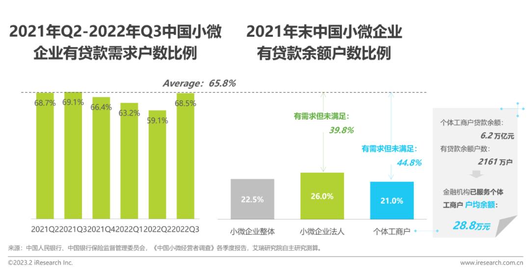 根据艾瑞测算,2021年末,1.03亿户的“小店”中仅21%获得了银行业金融机构的贷款支持,低于小微企业法人机构群体的26%,还有44.8%的“小店”群体有贷款需求却未被满足,庞大但脆弱的“小店”群体在小微企业融资供给结构性失衡问题中表现更为突出。