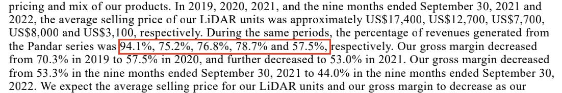 甚至这44%的毛利率,大部分体现的还是机械式激光雷达的财务模型。招股书也显示,2022年前三季度,Pandar系列产生的收入占比57.5%。