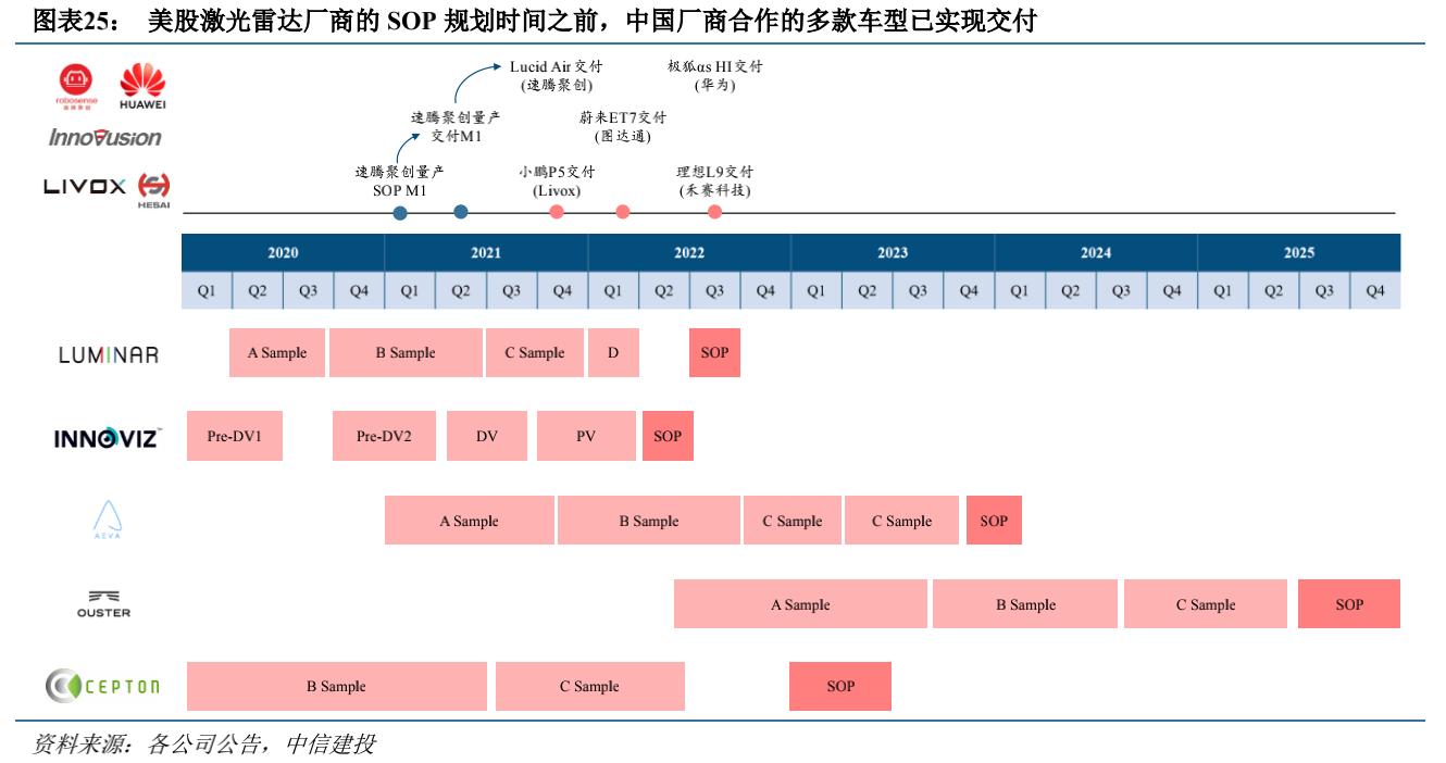 例如Luminar、Innoviz的半固态激光雷达从A样到SOP的规划时间都超过两年。而Aeva、Ouster等较前沿技术方案的SOP预期时点更为延后。相比之下,国内搭载禾赛、速腾产品的多款车型都已发布并在去年交付,相应的量产启动时间节点更靠前。