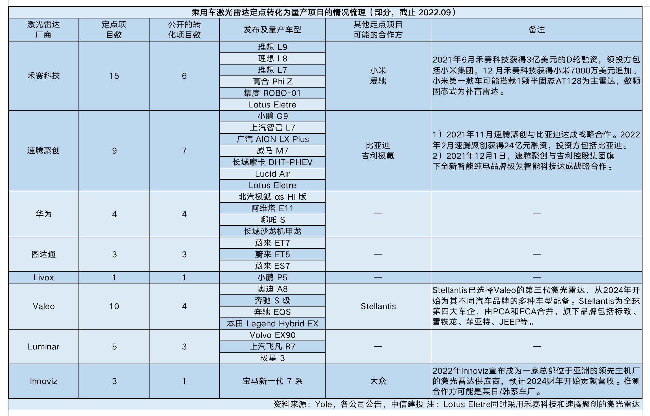 根据Yole数据和各家激光雷达供应商的公告信息,华为、图达通、Livox的定点都转化为了量产项目,速腾9项定点中8项已确认转化,禾赛15项定点中6项已确认转化,相关的车型都已发布或开启交付。