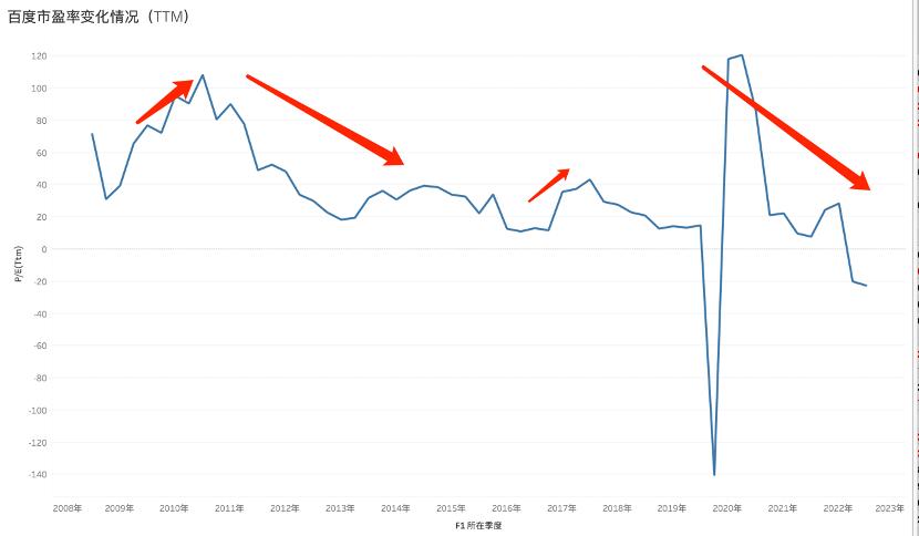 再看百度的市盈率走势情况,从节奏方面确实与谷歌比较接近(新旧业务交替市盈率的波动起伏),尤其在2016年确立AI战略之后,市盈率确实有一轮小阳春。与谷歌明显不同的乃是小阳春周期之短,几乎可用“转瞬即逝”来形容,这与谷歌接近10年的大运是截然不同的。