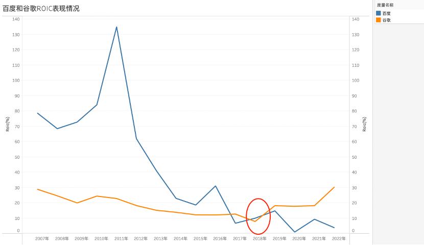 在找到第二曲线之后,谷歌之所以市盈率更为持久,很重要原因在于第二曲线并未过分透支企业的经营效率(虽下行,但较为平滑),百度则不同,由于原有搜索广告业务下行压力较大,与新业态的高投资膨胀辉映,拉低了企业整体的ROIC。