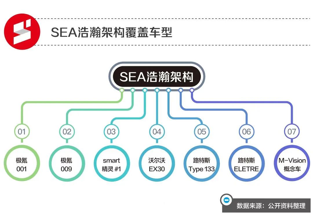 SEA架构是吉利开发的第一个纯电专属架构,相比于CMA架构,SEA的覆盖范围更广,可以实现1800mm到3300mm的轴距范围,覆盖A级到E级车,产品除了轿车、SUV和MPV之外,甚至包括皮卡和跑车。