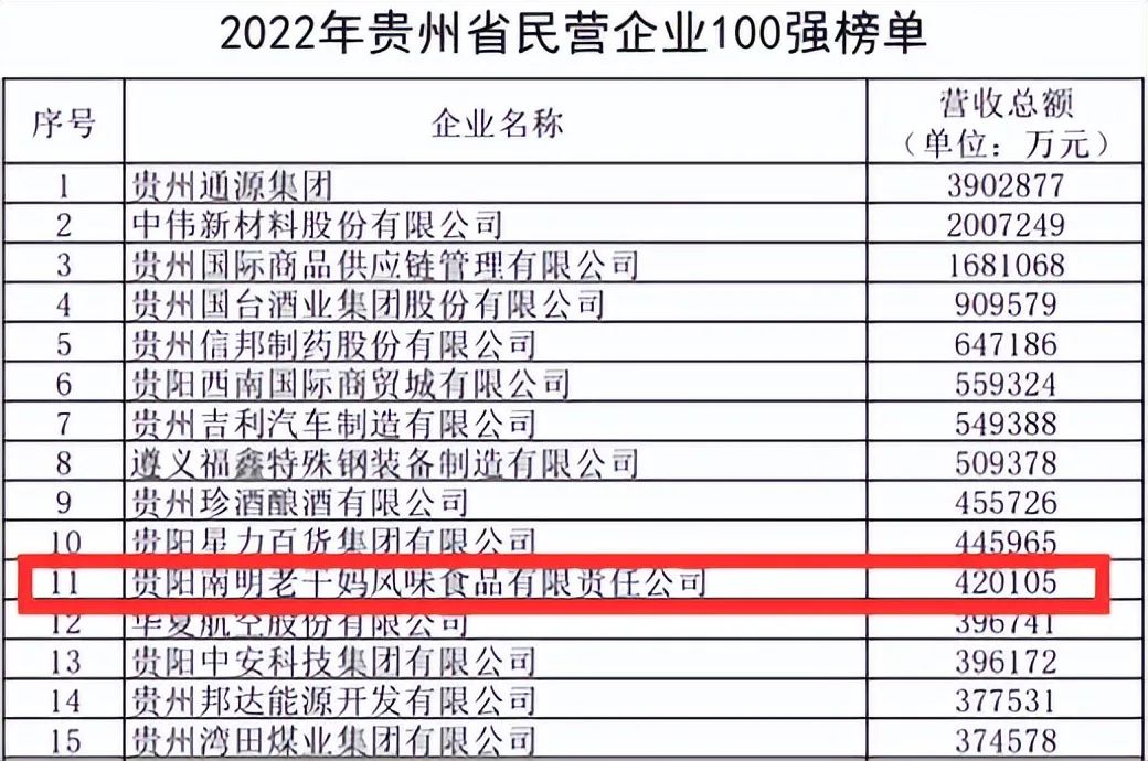 2022年老干妈营收为42.01亿元,减少了12亿,跌出贵州前10名。