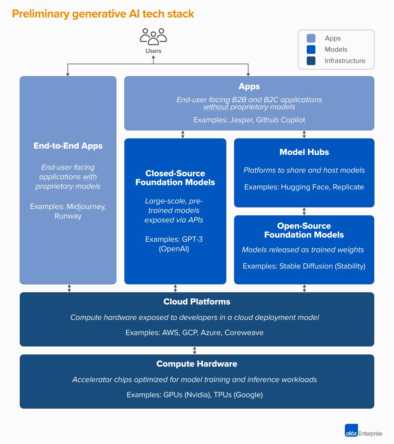 当下,我们开始看到生成人工智能技术堆栈出现的早期阶段。数以百计的新创业公司正在涌入市场,开发基础模型,构建人工智能原生应用程序,并建立基础设施/工具。