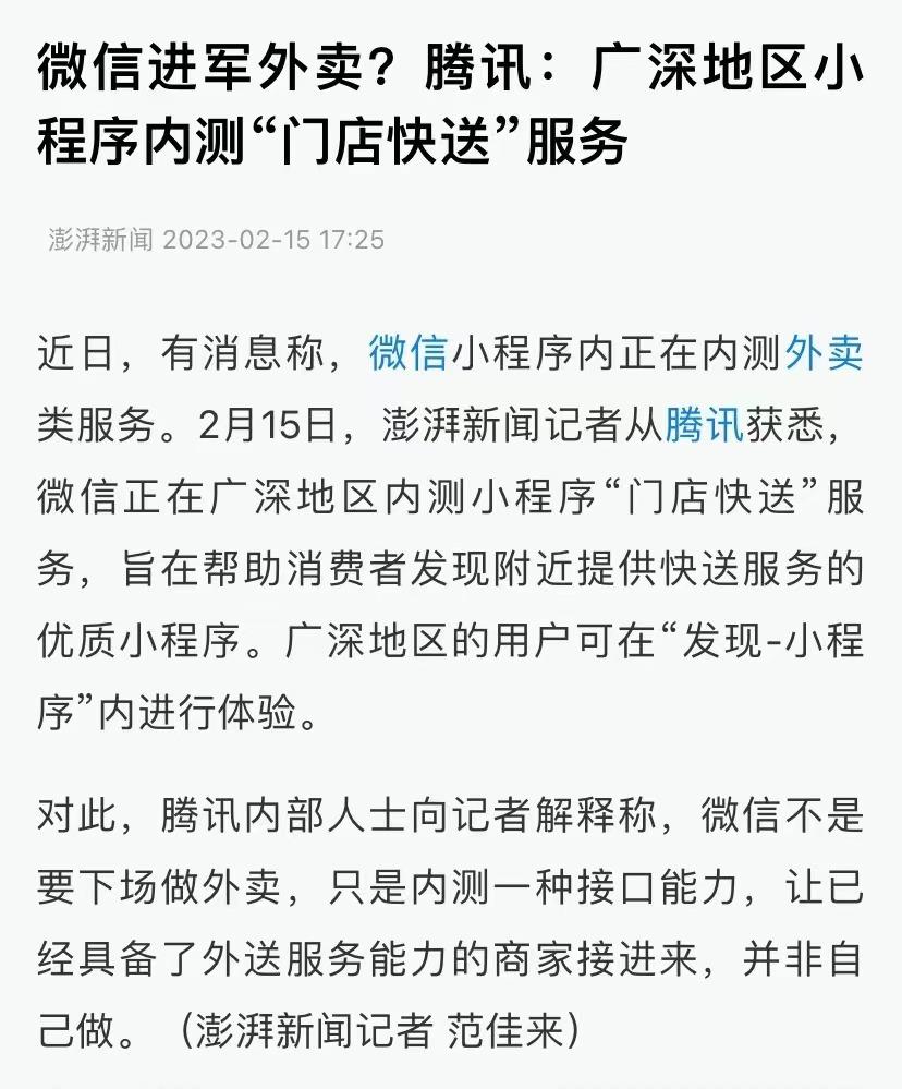 据腾讯官方回应,微信在广深地区内测“门店快送”服务,让已经具备外送服务能力的商家接入,并非自己下场做外卖。
