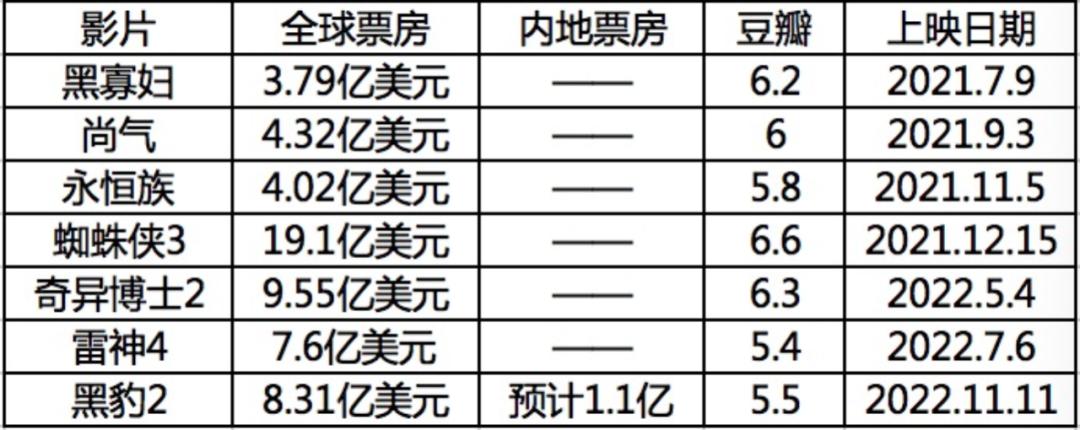 纵观整个漫威第四阶段影片来看,从票房上跟第三阶段相去甚远,口碑上也是跌至谷底。或许唯一的利好便是收官之作《黑豹2》成功登陆了内地市场,这也算是漫威唯一的欣慰了。遗憾的是影片最终仅能取得1亿的票房体量,跟前作的6.6亿可谓天壤之别。