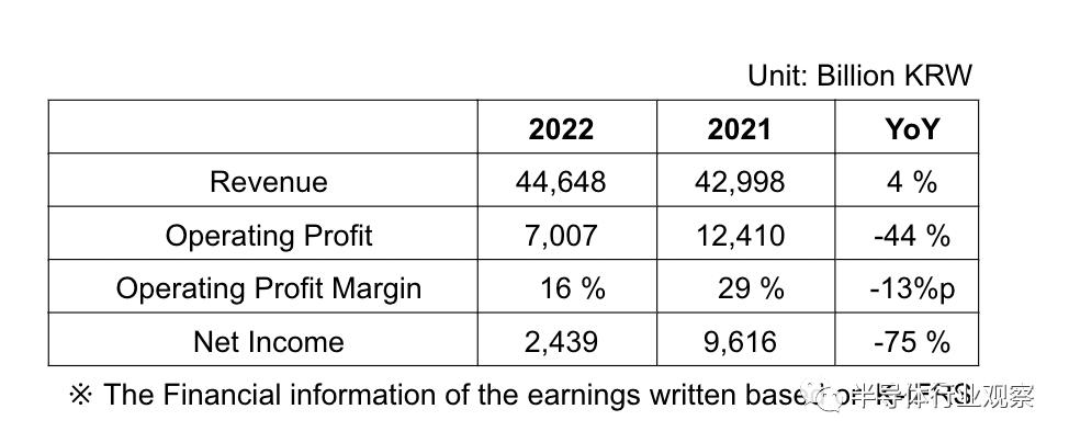 2022财年收入为44.648万亿韩元(363.2亿美元),同比增长4%,但营业利润约为7.007万亿韩元(合57亿美元),较2021年的12.41万亿韩元(合109.9亿美元)下降44%。