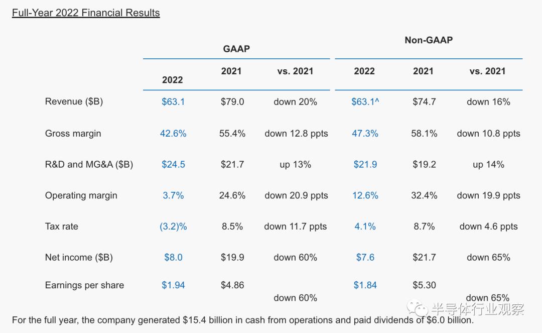 英特尔是芯片行业中遭受打击最严重的公司之一,因为其大约一般的收入来自其PC芯片部门。2022年英特尔全年营收为631亿美元,较2021年的790亿美元下跌20%,净利润为80.14亿美元,较2021年的198.7亿美元暴跌60%,这几乎是是英特尔20多年来最糟糕的年报。而且英特尔CEO基辛格表示,经济的不确定性持续到2023年。