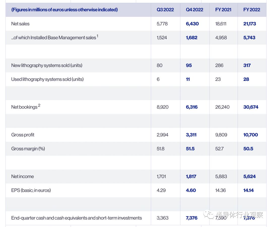 ASML 2022财年净销售额为212亿欧元,同比增长13.8%,净收入为56亿欧元,同比下降4.4%。从收入结构上来看,光刻机收入148亿欧元占比70%,量测为6亿欧元占比3%,其他安装与售后收入57亿欧元占比27%。光刻机实现销售345台,在光刻机产品结构中,EUV光刻机占比48%,共发货54台确认40台,浸没式81台,ArF dry28台,KrF151台,i-Line45台。2022年中国大陆市场为ASML贡献约22亿欧元收入(主要是DUV光刻机和量测设备),占ASML总收入的14%,占ASML EUV以外的整机设备收入的27%。ASML预计2023年将继续保持强劲增长,净销售额将增长25%以上。其中2022年底的积压订单达到创纪录的404亿欧元。
