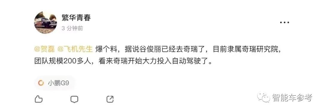 谷俊丽加盟奇瑞,用特斯拉小鹏经验,复刻「毫末智行」