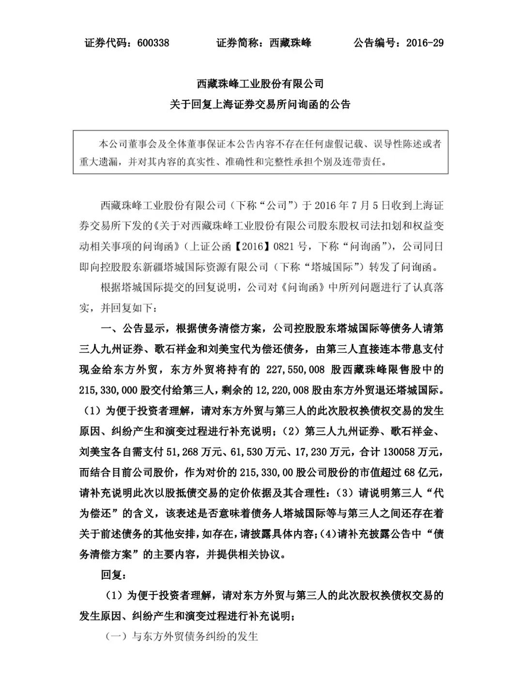 2013年1月,在法院的调解下,黄建荣用塔城国际所持有的塔中矿业46%的股权,抵下剩余的连本带息14亿元债务。2015年8月,西藏珠峰定增收购塔中矿业后,东方外贸顺势取得西藏珠峰34.85%的股权。但问题来了,股票有三年限售期。一心想拿回自己钱财的东方外贸,等不及股票解禁,于2016年6月再次将黄建荣告上法庭。