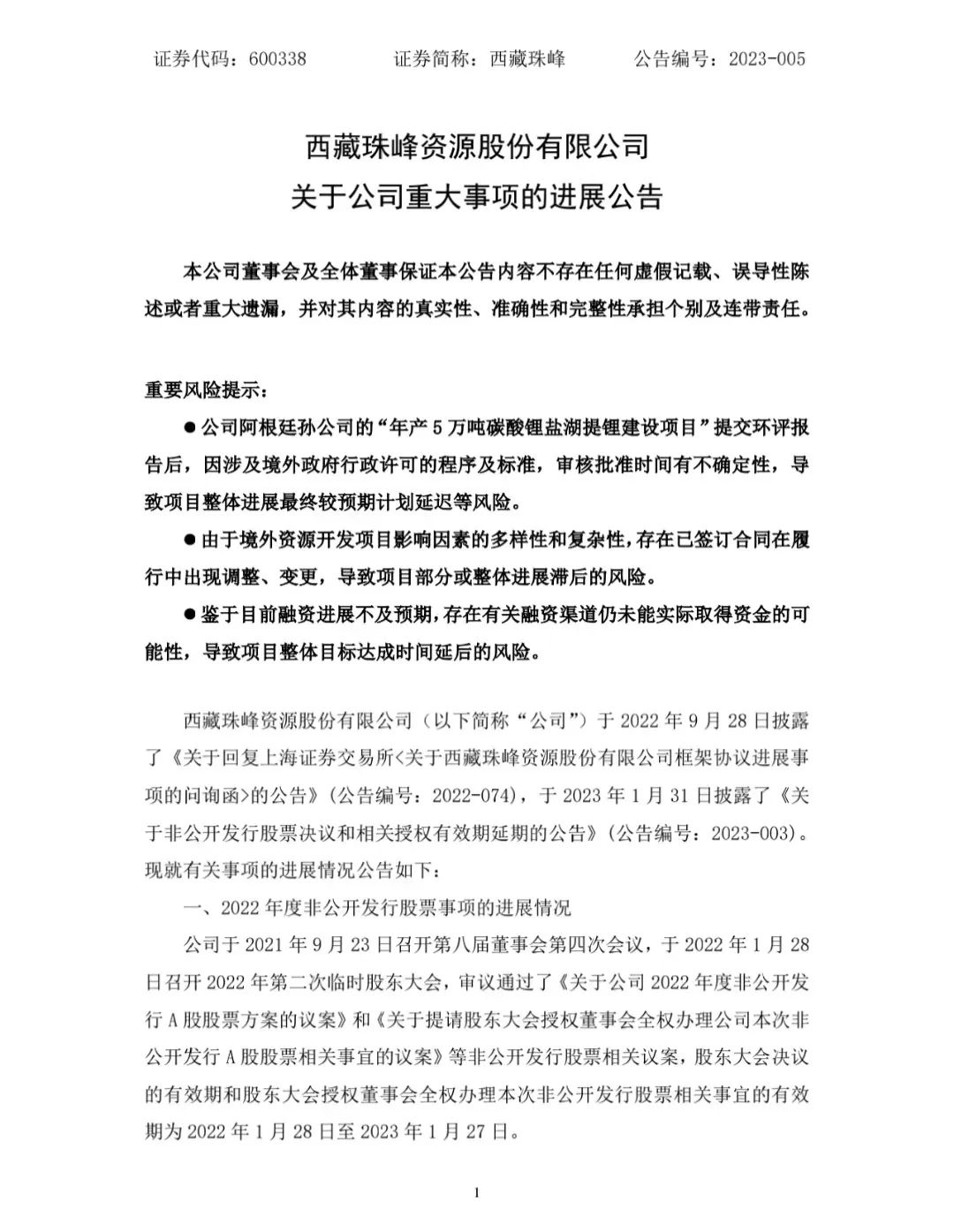 然而,这一切又成了空头支票。2月8日,西藏珠峰发布公告,年产5万吨发碳酸锂盐湖提锂项目,环保评审未过、融资无实质进展目,又要延期了。