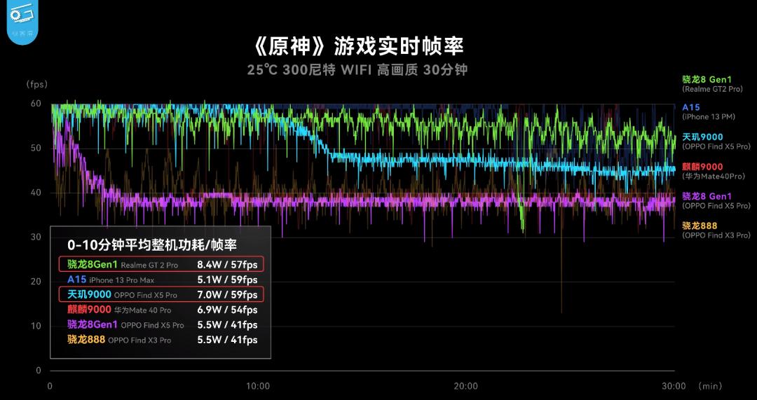 但在能效方面采用台积电 4nm 的天玑 9000 发挥就很出色,游戏功耗比 骁龙8Gen1 低了一截。