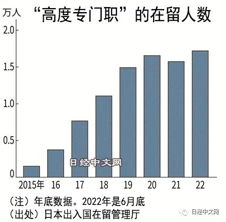 按具体国籍来看,截至2021年底,来自中国的占66%,远远领先于第2名印度(6%)和第3名韩国(4%)。日本政府希望在日元贬值背景下从国外吸引半导体和蓄电池工厂进驻日本。随着有实力的外国企业进驻日本,进入日本的高端外国人才可能会越来越多。