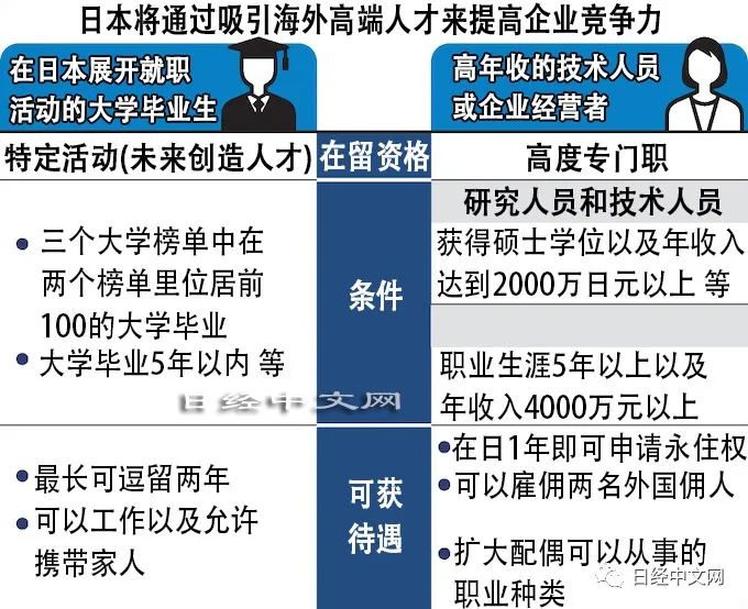 符合条件的人将成为“特别高度人才”,在日本逗留1年即可申请永住权。其他内容还包括允许雇用的外国佣人从目前的1人增加到2人,扩充配偶可全职从事的职业种类。