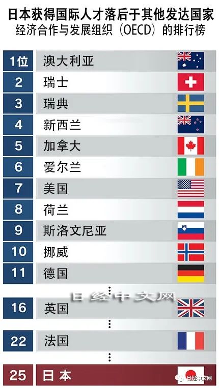 在经济合作与发展组织(OECD)2019年公布的国际人才吸引排行榜上,日本在35个国家中排在第25位。除了容易创业等“机会的品质”外,在配偶的就业及子女教育等“家人的环境”方面,评价较低。