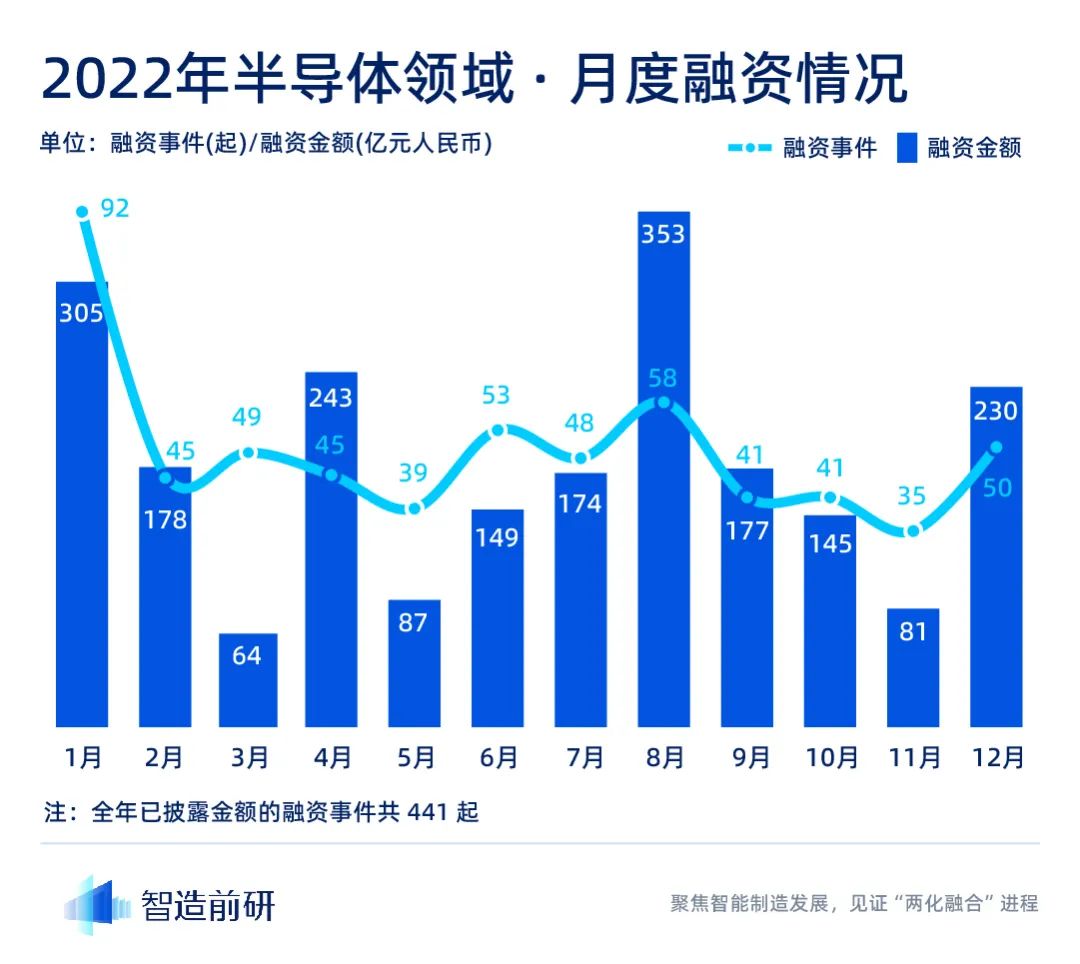 初入 2022 年,受芯片荒余波的影响,行业融资事件量和融资额处于非常高的位置,之后便迅速回落趋于平稳发展的状态,翻看这些公司的具体业务我们也能发现其中大多是负责芯片生产环节的企业,包括半导体原材料、生产加工和封装等等。当时间来到年中,随着芯片市场需求的减少和产能的过剩,资本投资的重点开始转向半导体设计研发领域,此时 10 亿元以上的大额融资开始增多,多数流向芯片研发和其他组件研发领域。8 月份是半导体行业 IPO 上市的集中时段,也将本月的月度融资额推上了全年最高峰,年末的融资金额虽有所下滑但却在 12 月份出现反弹,可能与海外国家进一步提高制裁范围有关。