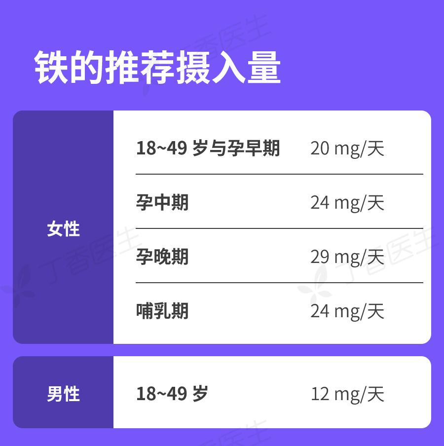 妊娠时期,孕妇的血容量和红细胞逐渐增加,胎儿、胎盘组织的生长都需要铁,所以孕中晚期尤其需要增加铁的摄入量。哺乳期的妈妈,要提供宝宝需要的铁,对铁的需求也较高。