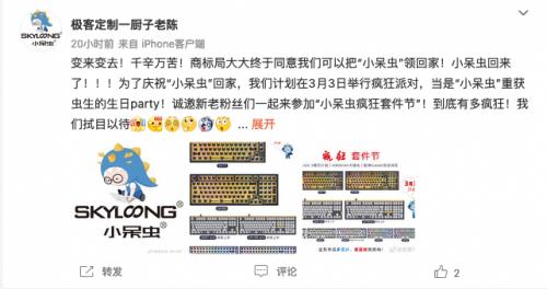 老陈还给我们讲了一个小故事:Skyloong商标这个英文中的“Loong”是中国龙的意思,祥龙之意;而不是西方Dragon带翅膀的龙,通常被象征为邪恶的龙。“我们在国内原本有个呆萌的中文名叫‘小呆虫’,是那种憨憨的样子,初出茅庐,不知天高地厚,不谙人情世故,但有种‘我命由我不由天’的年轻倔强,相信自己终有一天能一飞冲天,化身为龙!其实和我们今天所在客制化键圈处境有点像。”老陈说到,“小呆虫”这个中文名启用不久,就被商标局驳回了申请,被逼匆忙走上更名之路。后来经过各方努力申辩,他们最终取得了“小呆虫”的中文商标。为了纪念这个特殊的日子,老陈还特意选择了一天作为“小呆虫回归”的纪念日,并且取名叫“疯狂套件节”,全系产品按照“疯狂价”限量回馈粉丝。