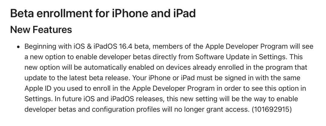 根据Apple给出的iOS & iPadOS 16.4 Beta更新日志,Apple在iOS和iPadOS(下文以iOS代称)中加入了新的“Beta注册计划”,该计划允许Apple开发者计划(Apple Developer Program)的成员在手机软件软件界面直接看到开发者测试版本系统(Developer Beta)的升级选项,该选项将自动出现在已经注册在Apple开发者项目的设备。