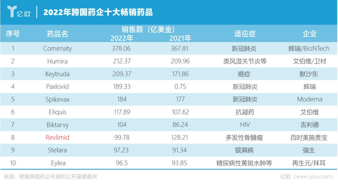 在十强榜单中,有表现优异的,自然也有地位垂危的。BMS的血液肿瘤药Revlimid(来那度胺)就以99.78亿美元跌出了百亿美元俱乐部。BMS对这款产品的期待已经大幅降低,预计2023年销售额将下滑到65亿美元。