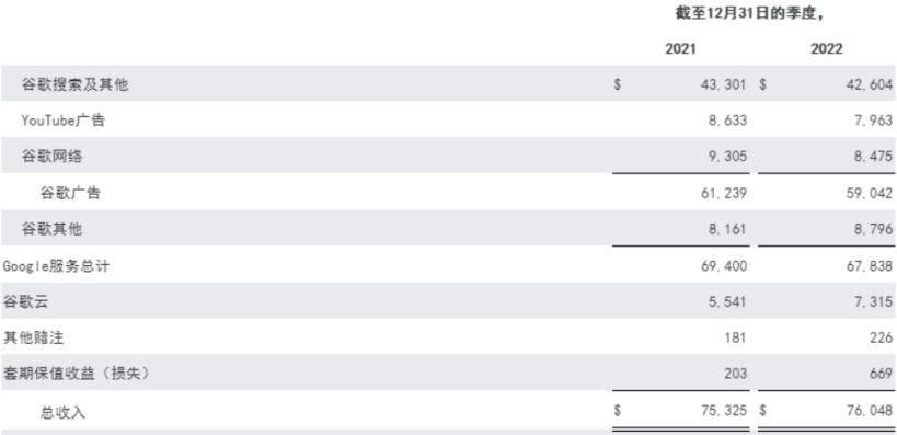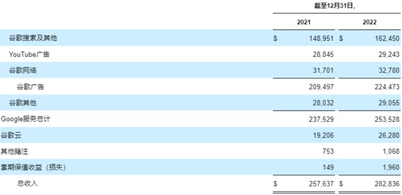 2022年全年,谷歌服务贡献营收2535亿美元,同比增长7%,收入占比约为90%,其中谷歌广告业务共实现营收2245亿美元,收入占比约为80%;谷歌云贡献营收263亿美元,同比增长37%,收入占比约为9%;其他业务实现营收10.7亿美元,对冲收益贡献营收约20亿美元,二者合计营收占比约为1%。