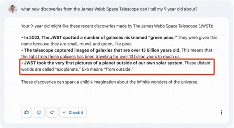 2月8日,为了应对ChatGPT向人工智能领域发起的挑战,谷歌在巴黎举行的AI发布会上向外界正式披露了其聊天机器人产品Bard(巴德)。在其中的一条演示视频中,Bard回答了一个关于詹姆斯·韦伯太空望远镜新发现的问题,称它“拍摄了太阳系外行星的第一批照片”。