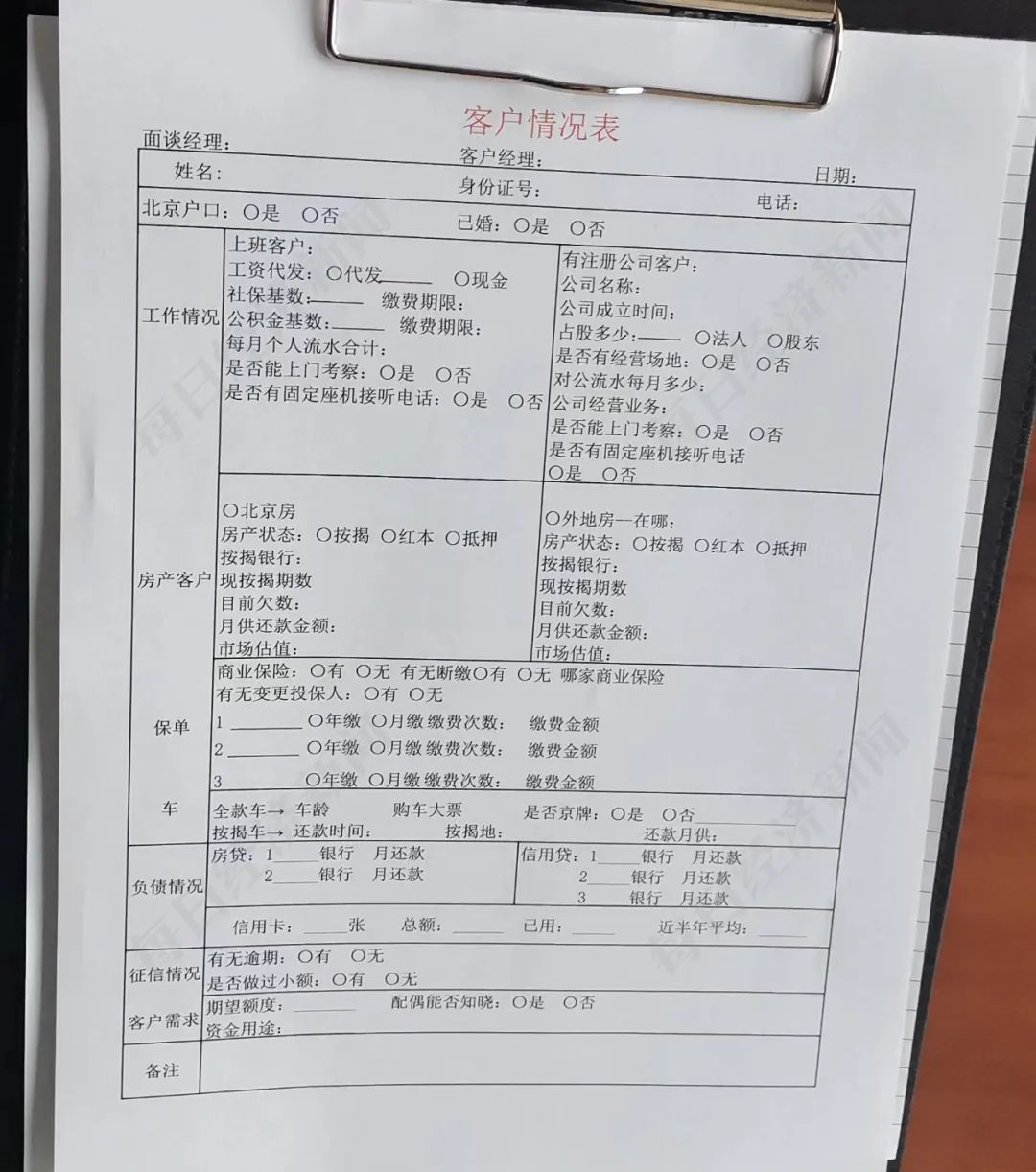 面对记者的质疑,老吴含糊其辞:“咱们属于签约部,前期负责收集资料。完了给你匹配产品,咱们就去行里签约就可以了。”说着,他便拿出一张信息采集表来。