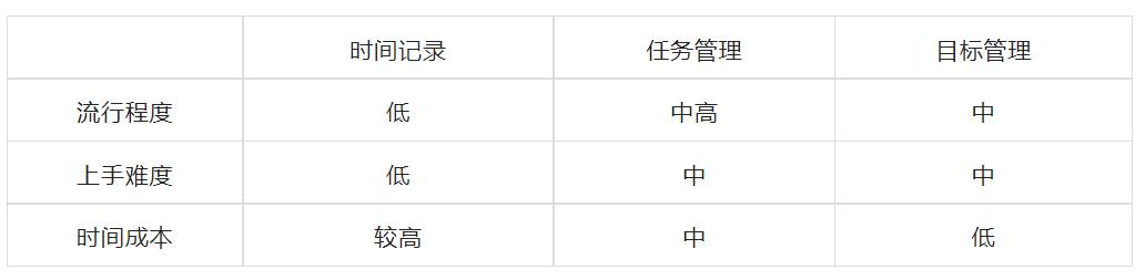 为了帮助大家了解适合自己的时间管理方法,我把常见的时间管理方法分为 3 种类型:时间记录、任务管理、目标管理。在反复尝试过这些方法后,我对它们的优缺点和适用范围都有所了解,在此总结了一个简单的表格,供你参考: