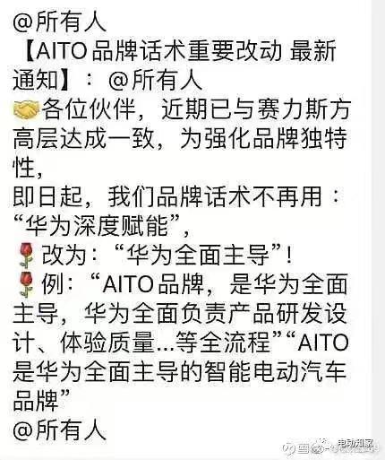 不久前,汽车圈流传一张截图显示,华为与赛力斯达成一致,AITO品牌话术,由“华为深度赋能”,改为“华为全面主导”。