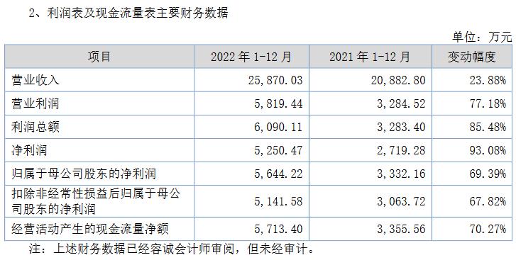 业绩方面,2022年,公司实现营业收入2.59亿元,同比增长23.88%,净利润为5644万元,同比增长69.39%。