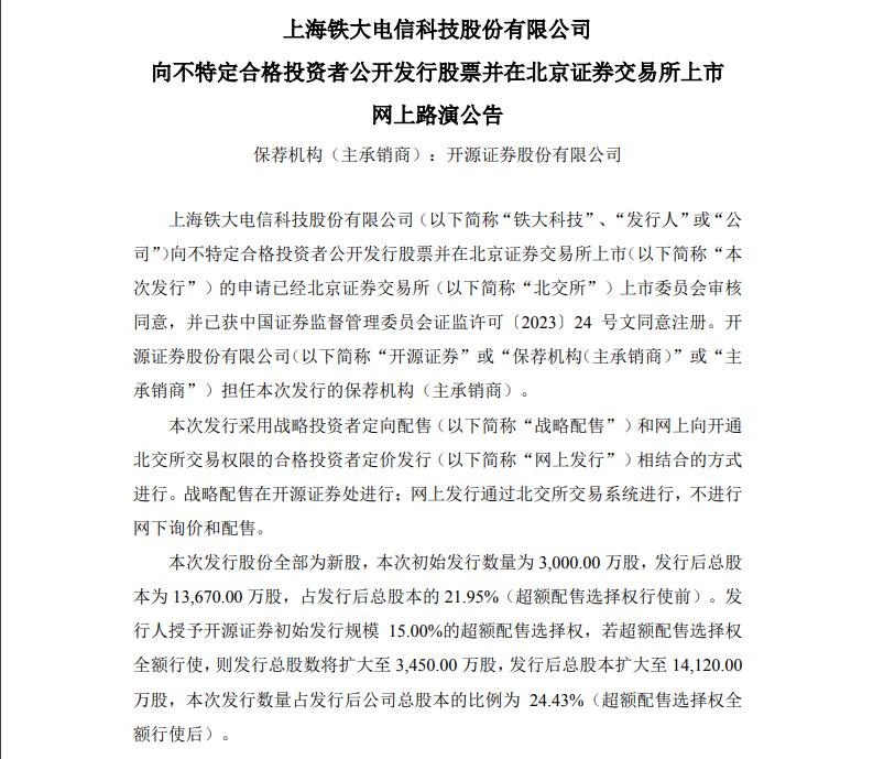铁大科技发行价格为3.38元/股,发行市盈率为15.99倍,本次发行网上申购时间为 2023年2月24日(T 日)的 9:15-11:30,13:00-15:00,发行代码为“889109”。