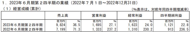 寿屋最新发布的2022年3、4季度累计(2022.7.1-2022.12.31)财报数据显示,销售额98.24亿日元,同比增长36.5%;当期纯利润11.21亿日元,同比增长22.6%。