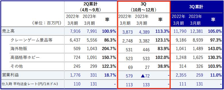 2022年2、3、4季度,Furyu的玩具事业累计销售额123.81亿日元,同比增长5.0%,营业利润2.59亿日元,同比大幅减少89%,同比增收减益。受日元贬值影响,采购成本增加,利润下降。