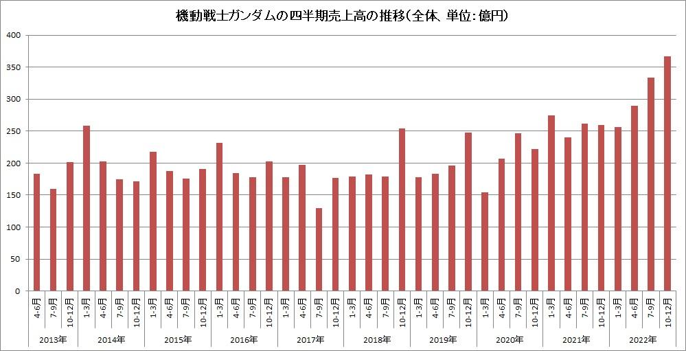 从上图可以看出,2022年二三四季度万代《机动战士高达》单季度销售额屡创新高,二季度单季度销售额290亿日元,三季度销售额334亿日元,四季度销售额367亿日元,再次刷新历史记录,保持持续高增长态势。