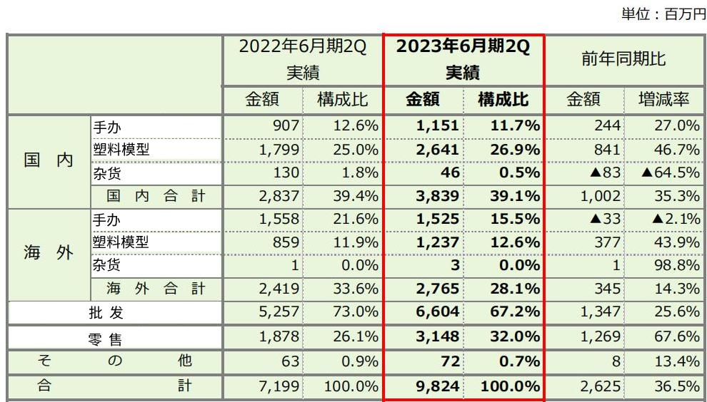 下半年寿屋的海外地区手办销售额15.25亿日元,同比下降2.1%,塑料模型销售额12.37亿日元,同比增长43.9%。