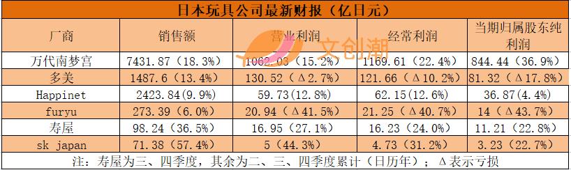 近日,万代南梦宫、多美、Happinet、Furyu、寿屋、SK Japan等几家主营业务含玩具的日本公司先后披露了最新季度的财务营收数据。