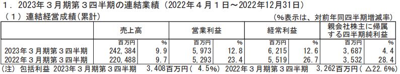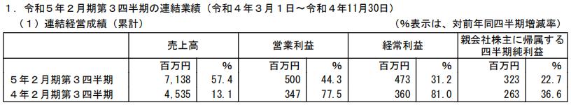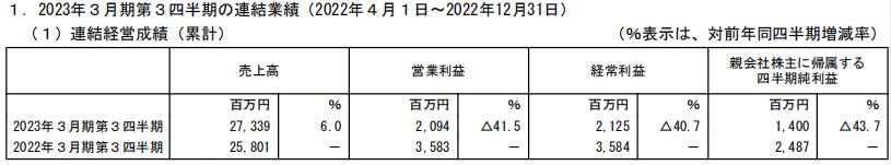 SK Japan最新发布的2022年2、3、4季度累计(2022.3.1-2022.11.30)财报数据显示,销售额71.38亿日元,同比增长57.4%;归属股东当期纯利润3.23亿日元,同比增长22.7%。全面增收增益。